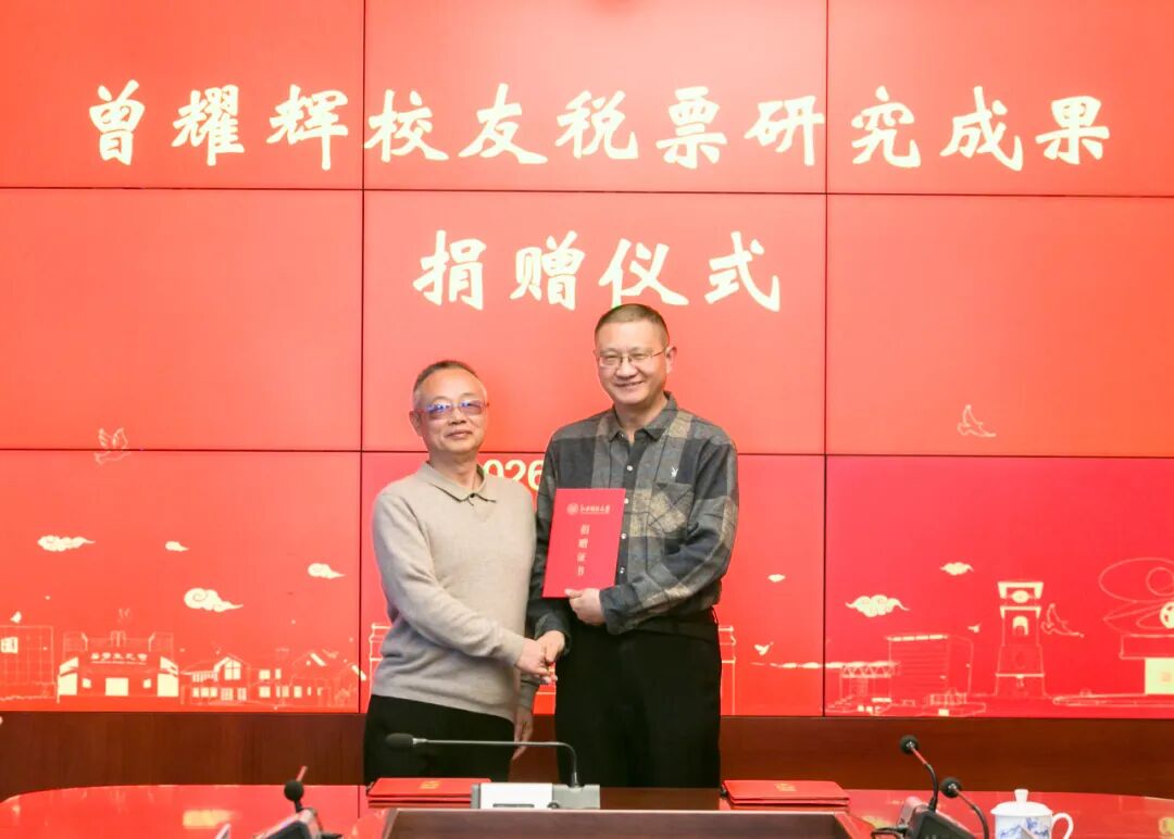 曾耀辉表达了他对母校重视财经文化传统及多年悉心培养的感激之情。母校给予的关怀与支持,始终是他前行路上的重要动力,他也将支持母校学科建设视为自己义不容辞的责任。他表示,税票的收藏与研究是自己毕生投身的事业,此前捐赠税票实物所建成的博物馆,已催生多项学术成果,令他倍感欣慰。此次捐赠,他希望将围绕这批税票文物所取得的研究成果及相关荣誉全部捐给母校,使其形成集典藏、展览、育人和研究为一体的平台和基地。他期盼以此为起点,激励后来者不断探索,使薪火相传、学术永续。